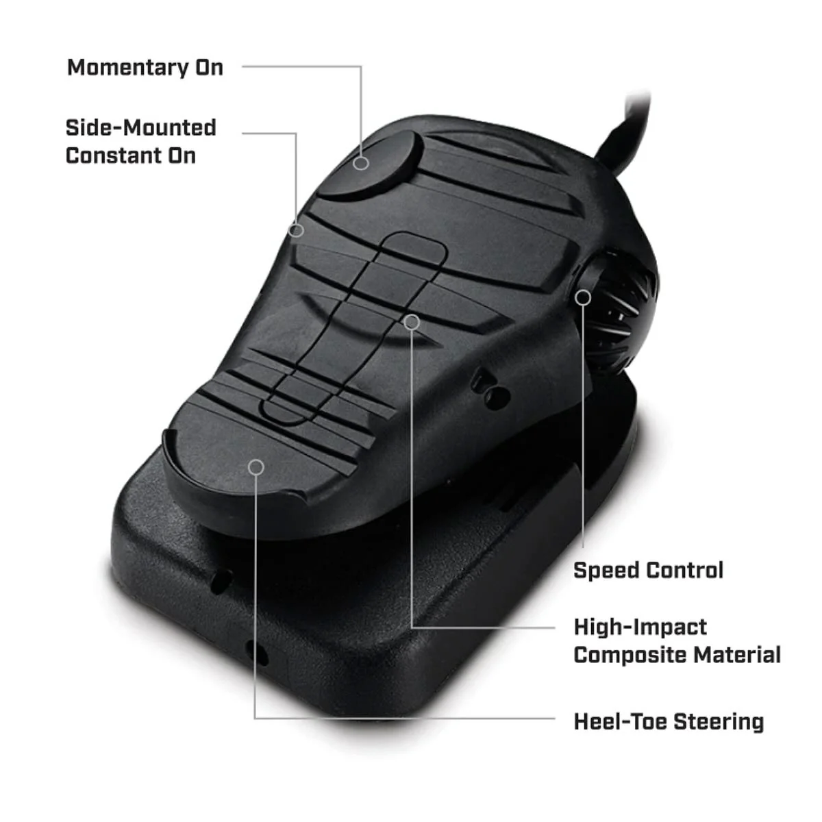 Variable Speed Motor, Cable-Driven Foot Pedal, Dual Spectrum CHIRP Sonar, Digital Maximizer, Bounce Buster, Illuminated Directional Indicator, Weedless Wedge Prop, Composite Shaft. (Learn about these features)