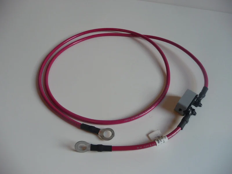 - The included cable has heat shrink and ring terminal connections on both ends of the cable